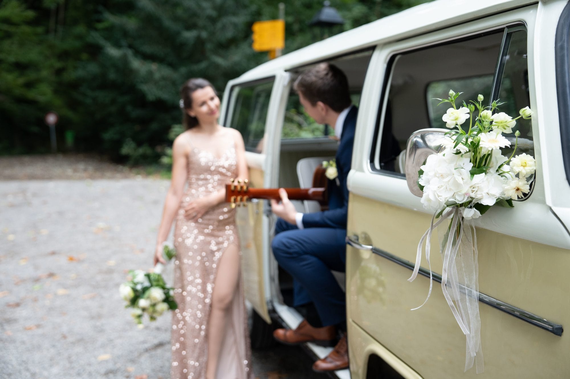 - Individuelle Floristik & Hochzeitsdekoration des Oldtimers genau nach Kundenwunsch